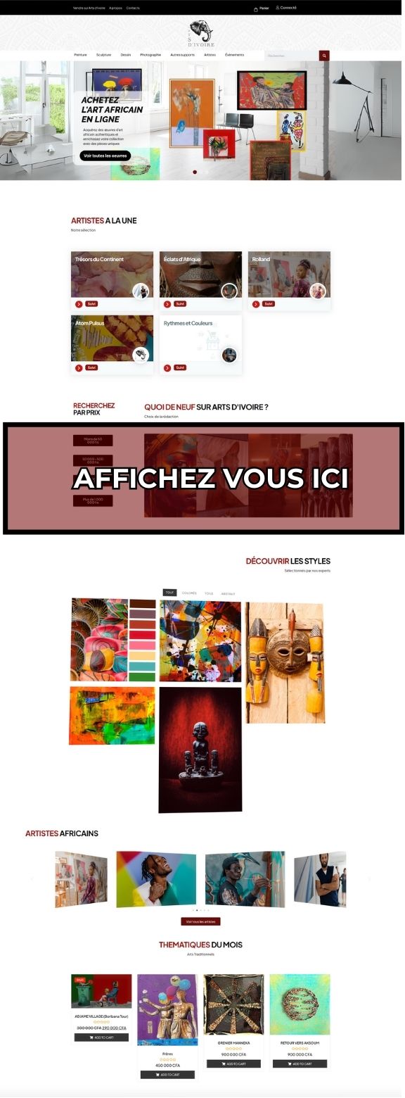 - Description: Ce forfait comprend une insertion des œuvres ou profil de l’artiste sur la plateforme ARTS D’IVOIRE ainsi qu’une publication sur l’un des réseaux sociaux de la plateforme ARTS D’IVOIRE (Méta ou Instagram ou Twitter ou TikTok ou encore BlueSky) pendant 24h